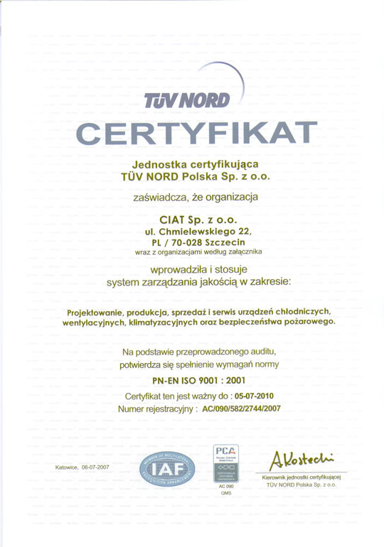 Przyznany certyfikat obejmuje następujący zakres działalności Firmy: projektowanie, produkcja, dystrybucja oraz świadczenie usług serwisu gwarancyjnego i pogwarancyjnego w zakresie urządzeń klimatyzacyjnych, chłodniczych, wentylacyjnych, wymiany i akumulacji energii cieplnej, a także bezpieczeństwa pożarowego. Zarząd wyznaczył główne kierunki w realizacji Polityki Jakości: